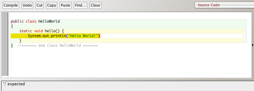 - See how a syntax error (typo/bad grammar) is shown in BlueJ.